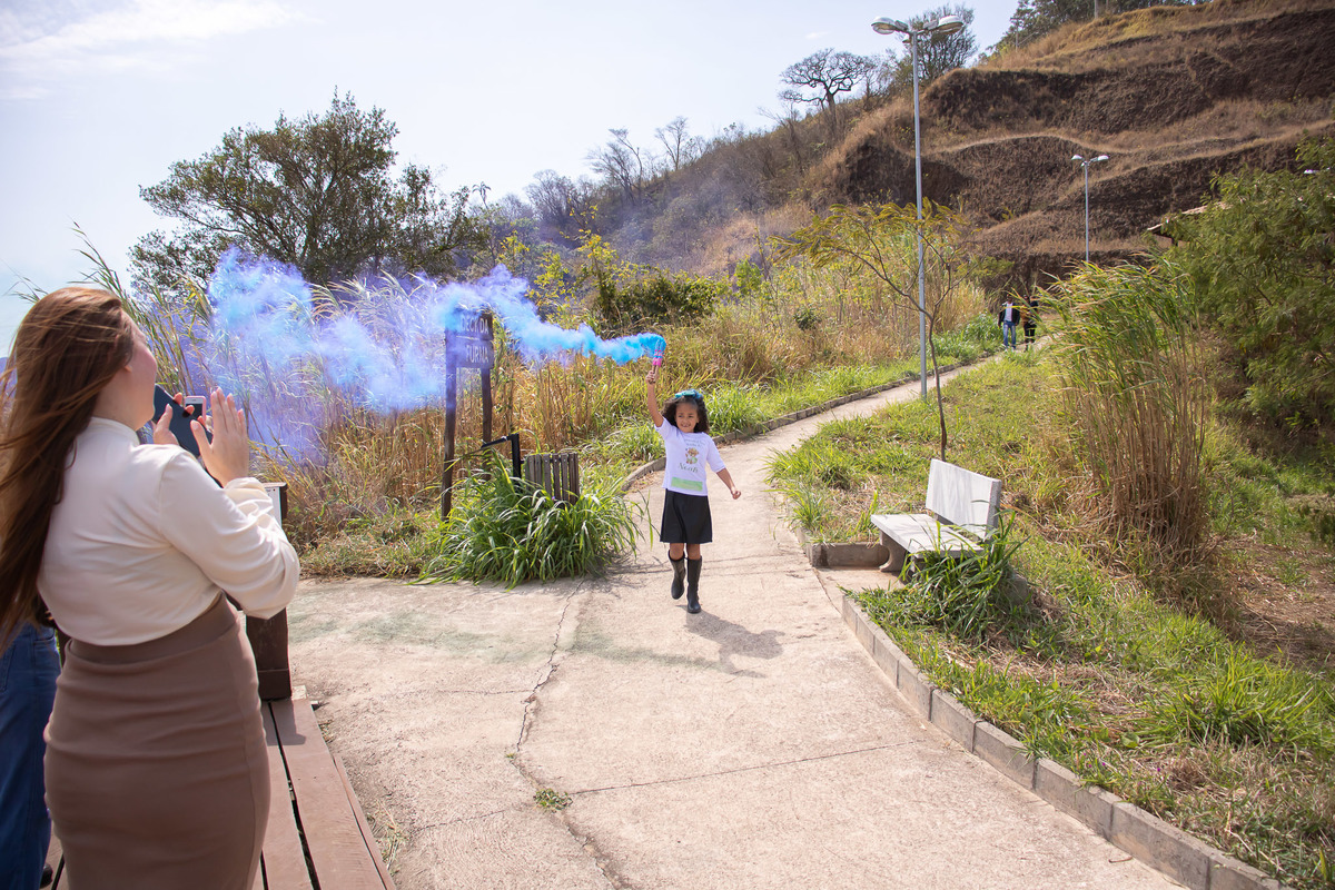 Claro que rolou uma trolagem com o estouro de 3 balões que não traziam nenhuma novidade dentro kkkkk para só então a irmãzinha do bebê descer correndo com a fumacinha azul nas mãos. Se liga no salto que o pai deu ! kkkkkkkkkk